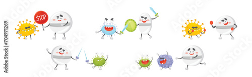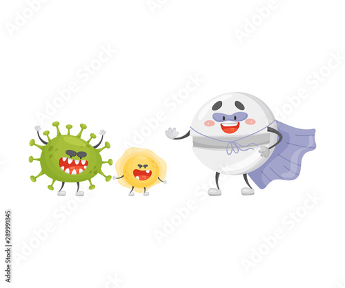 Симпатичный персонаж супергероя-таблеточника со щитом, борющийся с вирусами, микробами и бактериями векторной иллюстрацией. Медицинский ребенок-доктор, лекарство, сдерживающее болезнь, изолирует врага на белом фоне