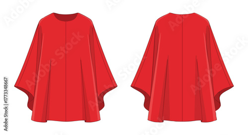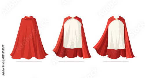 Красная шелковая накидка супергероя, плащ, мантия, вид спереди, сзади и сбоку, векторная иллюстрация, изолированная на белом фоне. Карнавальная одежда, маскарадный костюм и т.д.