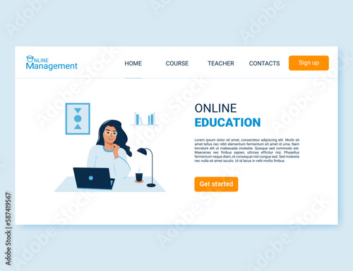 Векторный шаблон веб-сайта центра поддержки, дизайн веб-страницы и целевой страницы для разработки веб-сайтов и мобильных сайтов. Женщина-оператор в гарнитуре, предоставляющая информацию о продукте, решения часто задаваемых вопросов и проблем.