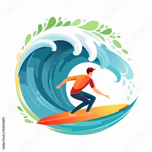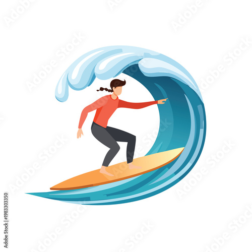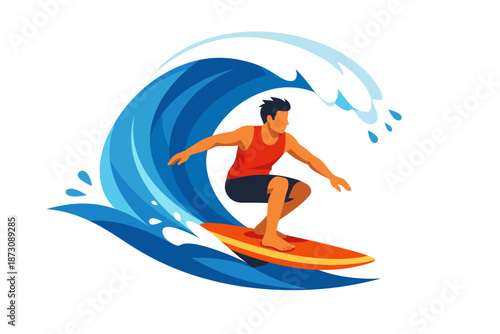 Векторная иллюстрация серфера в гидрокостюме, стоящего на доске для серфинга и катающегося на океанской волне. Элемент дизайна концепции пляжных водных экстремальных видов спорта в плоском стиле.