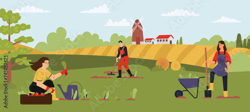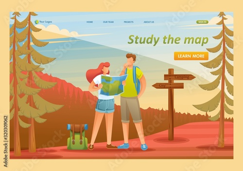 Шаблон векторного веб-баннера для кемпинга на выживание. Персонажи мужского и женского пола рубят дрова, собирают ягоды, ловят рыбу, готовят еду на огне, ретро-плоская иллюстрация. Выживание в лесу, горах.