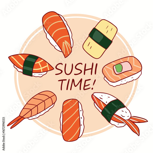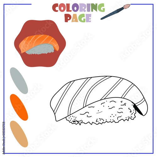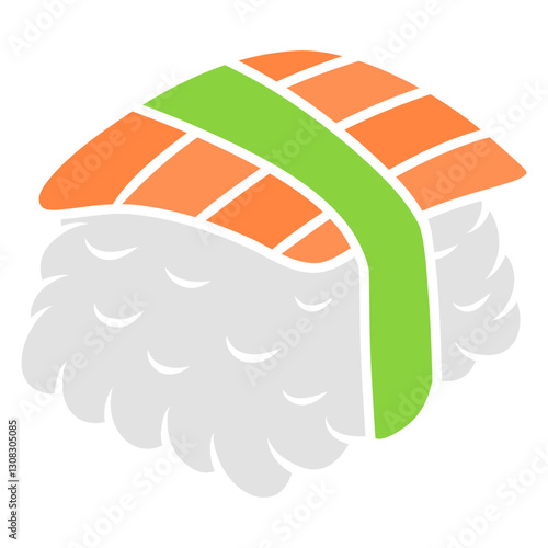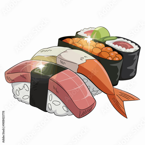 Суши ролл каваи векторный японский милый мультфильм. Кавайное лицо сашими с рисом и креветками. Забавный значок восточного фастфуда, выделенный на белом фоне