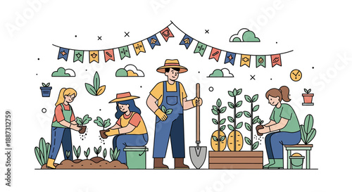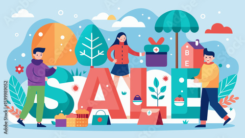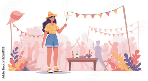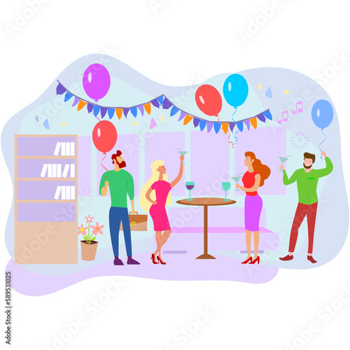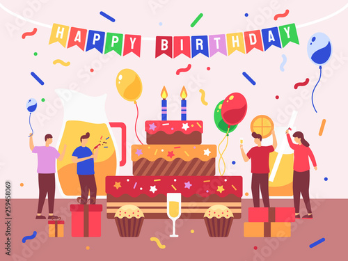 Группа молодых людей празднует 20-летие со дня рождения с огромным тортом со свечами, воздушными шарами, подарочными коробками, векторной плоской иллюстрацией. Сладкая композиция для вечеринки в честь 20-летия для веб-баннера, страницы websit