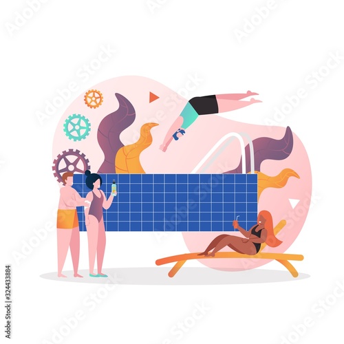 Мужские и женские персонажи загорают, прыгают в воду в бассейне, векторная иллюстрация. Летний пляжный отдых, концепция открытого бассейна для веб-баннера, страницы веб-сайта и т.д.