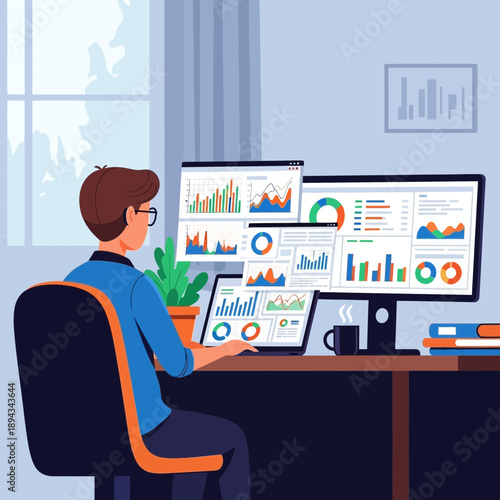 Системный администратор, программист мужской мультяшный персонаж, сидящий за столом перед компьютером, плоская векторная иллюстрация. Разработчик программного обеспечения работает на ноутбуке в офисе. Компьютерное кодирование и программирование