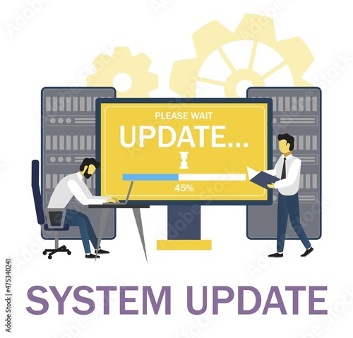 Системные администраторы, обновляющие операционную систему, плоская векторная иллюстрация. Установка программного обеспечения, обновление или техническое обслуживание компьютерной системы.