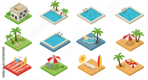 Набор значков настольной игры. Векторная изометрическая иллюстрация аэрохоккея, пула, футбола, мини-гольфа, столов для пинг-понга.
