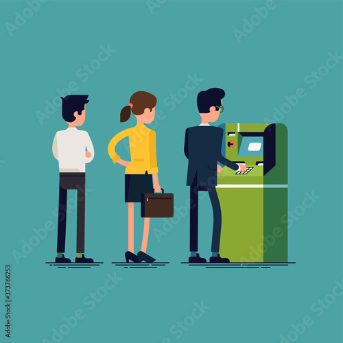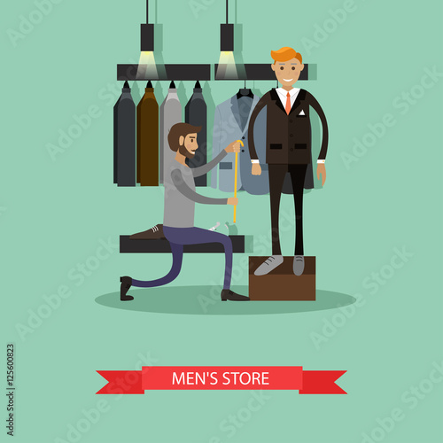 Портной снимает мерки со своего клиента-мужчины, чтобы сшить костюм на заказ. Концепция мужской моды. Интерьер магазина одежды. Баннер с векторной иллюстрацией в плоском стиле.