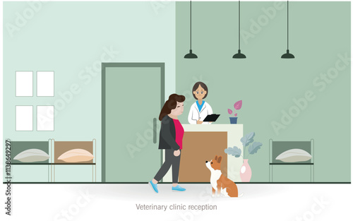 Векторная иллюстрация ветеринарного врача, разговаривающего с женщиной о диагнозе после медицинского осмотра ее любимой собаки. Элемент дизайна концепции услуг ветеринарной клиники в плоском стиле.