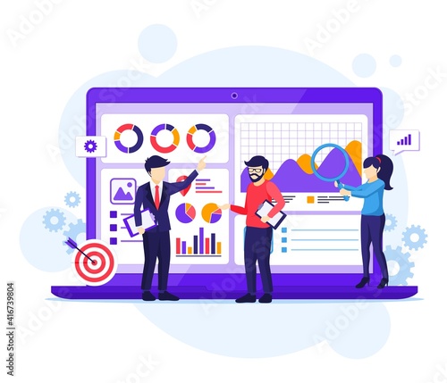 Векторная иллюстрация концепции охвата целевой аудитории. Персонажи мужского и женского пола анализируют статистическую информацию о результатах стратегии таргетирования на клиентов - мужчин и женщин, цифровой маркетинг.