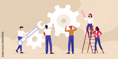 Огромный знак цели со стрелкой, мужские персонажи с мегафоном, стоящие на диаграмме анализа цели, с помощью мобильного телефона, векторная иллюстрация. Концепция стратегии таргетинга для веб-баннера, страницы веб-сайта и т.д.