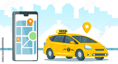 Такси онлайн, плоская векторная изометрическая иллюстрация. Смартфон с картой города, пин-кодом местоположения и желтой машиной. Мобильное приложение службы такси.