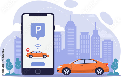 Изометрический смартфон с желтым такси, едущим по дороге, пин-кодом города и местоположения, векторная иллюстрация. Мобильное приложение службы такси, концепция приложения для онлайн-навигации.