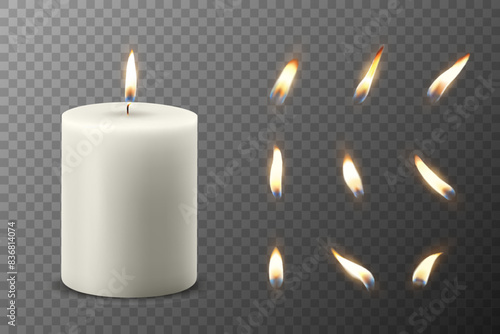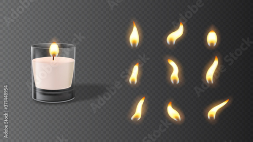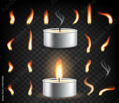 Горящая свеча и набор пламени. Векторная иллюстрация, изолированная на прозрачном фоне. Маленькие приземистые реалистичные свечи Tea или tealight в металлическом футляре со спрайтами анимации огня.