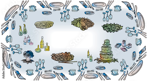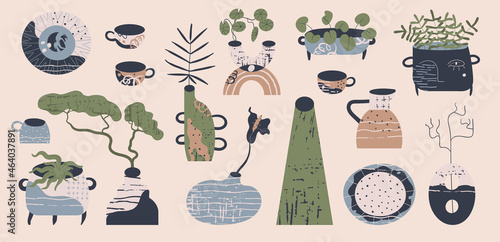 Набор оборудования для чайной церемонии векторная иллюстрация. Традиционная японская и китайская чайная посуда и аксессуары, чайник, керамическая чашка, ложка. Рисованный баннер и плакат.