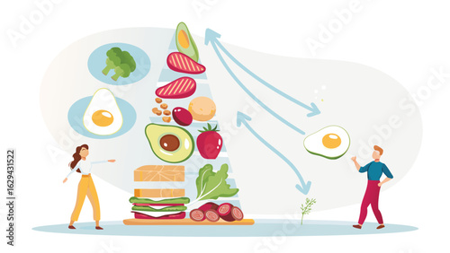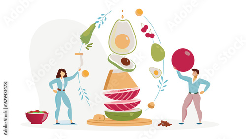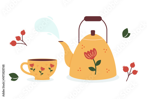 Огромный чайник, микро-мужские и женские персонажи готовят вкусный горячий чай с лимоном и кексом, векторная иллюстрация дизайна в плоском стиле. Чайхана, кафе, композиция для чаепития.