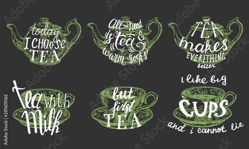 Чайные цитаты и изречения ручной надписью типография, векторная иллюстрация. Винтажные этикетки, эмблемы с нарисованными от руки чашками, заварочными чайниками и вдохновляющими короткими фразами о чае на белом фоне.