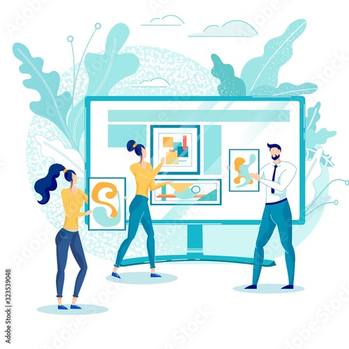 Профессиональная бизнес-команда, микро-мужские и женские персонажи, анализирующие статистическую панель на огромном экране монитора компьютера, векторная иллюстрация. Концепция командной работы для веб-баннера, страницы веб-сайта и т.д.