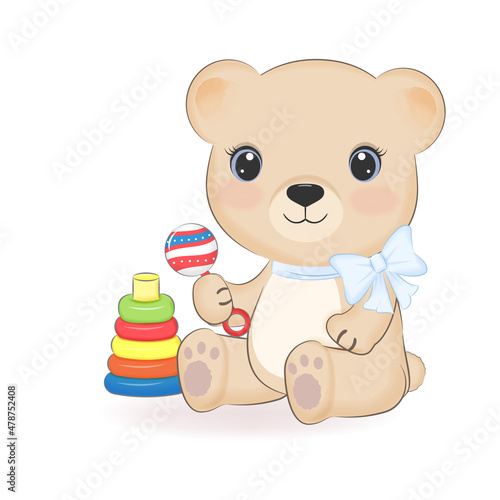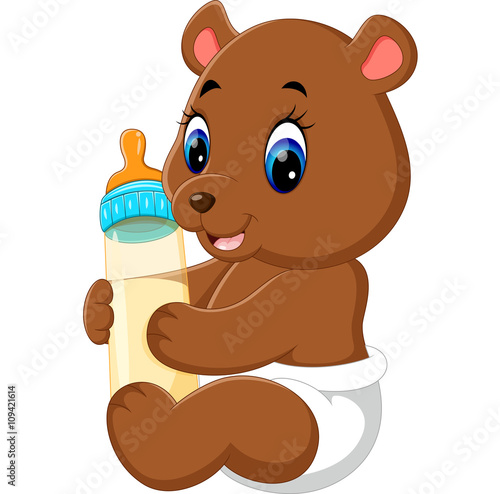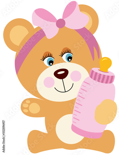 Вектор плюшевого мишки, держащего бутылочку детского молока с соской. Значок милой игрушки для приглашения. Аксессуар для празднования дня рождения новорожденного ребенка, выделенный на белом фоне