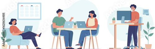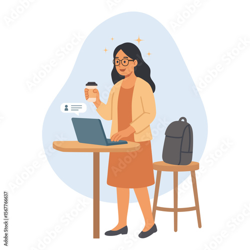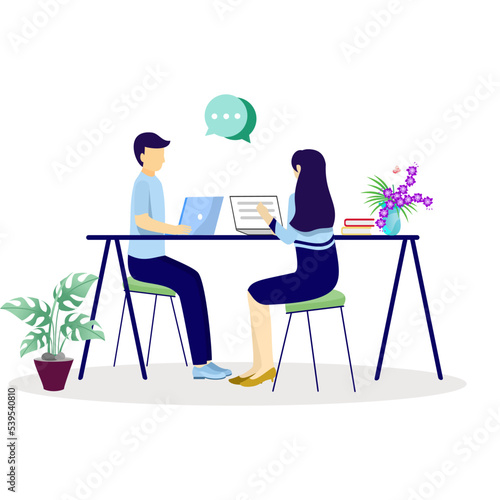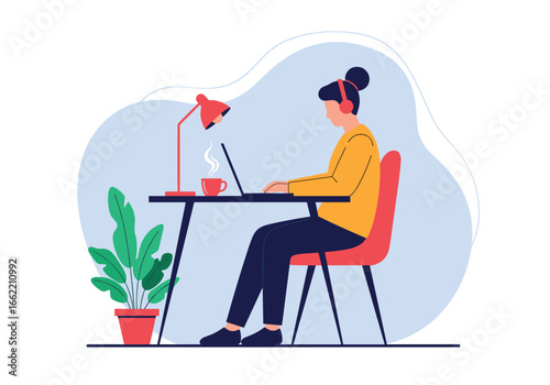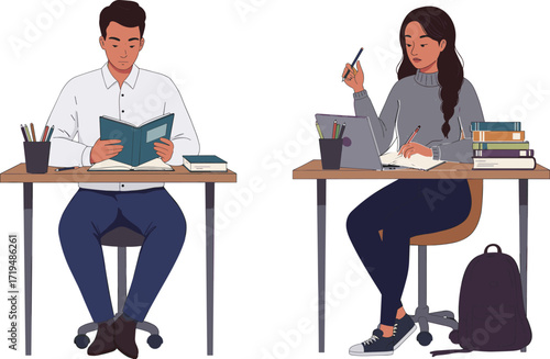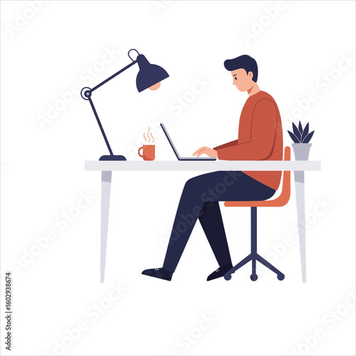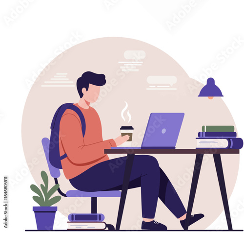 Студент-подросток наслаждается домашним обучением, сидя за столом перед компьютером с векторным значком онлайн-урока, изолированным на белом фоне