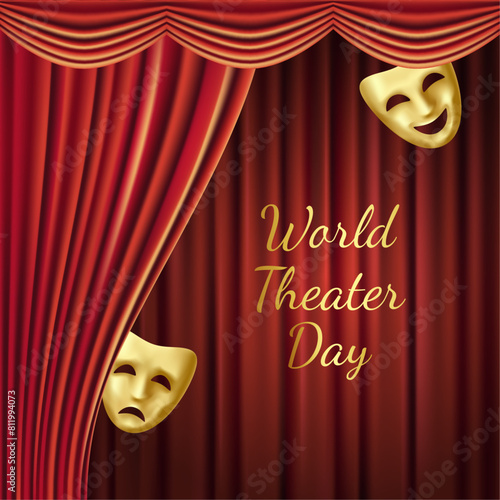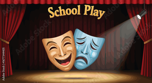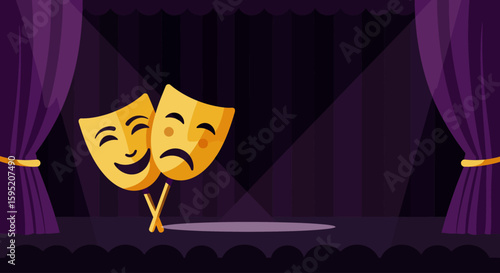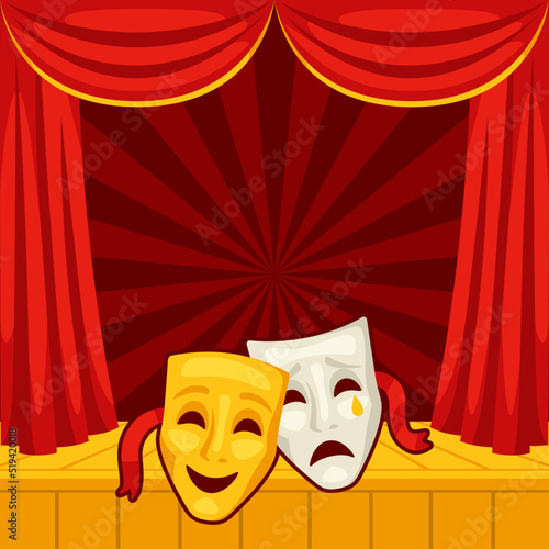 Шаблон векторного плаката театрального фестиваля. Реалистичная театральная деревянная сцена с красным бархатным занавесом и вырезанными из бумаги театральными трагедийными и комедийными масками. Сцена для концерта, премьеры фильма, шоу талантов и т.д.
