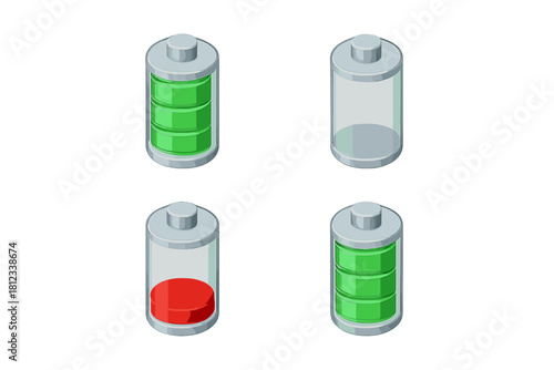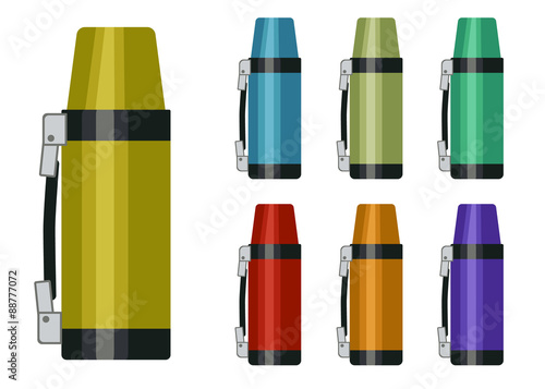 Мультяшный вектор термоса. Изолированный набор термокружек. Многоразовая фляжка для горячего кофе, теплого чая и воды иллюстрация. Пластиковая и вакуумная бутылка из нержавеющей стали с крышкой на белом фоне