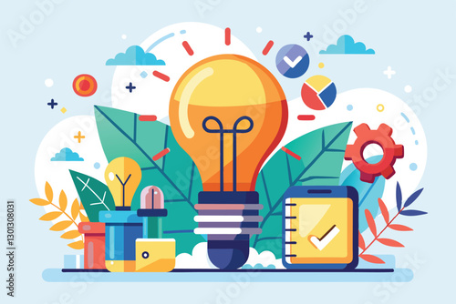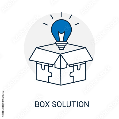 Продумывание концепции "из коробки". Лампочка, появляющаяся из картонной упаковки и символизирующая новую творческую идею. Векторная иллюстрация в плоском стиле.
