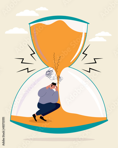 Векторная иллюстрация концепции управления временем. Бизнесмен тонет в песочных часах. Крайний срок выполнения проекта.