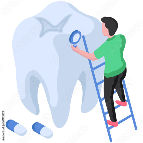 Крошечный доктор стоматолог, отбеливающий огромный векторный значок зуба, изолированный на белом фоне
