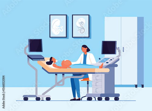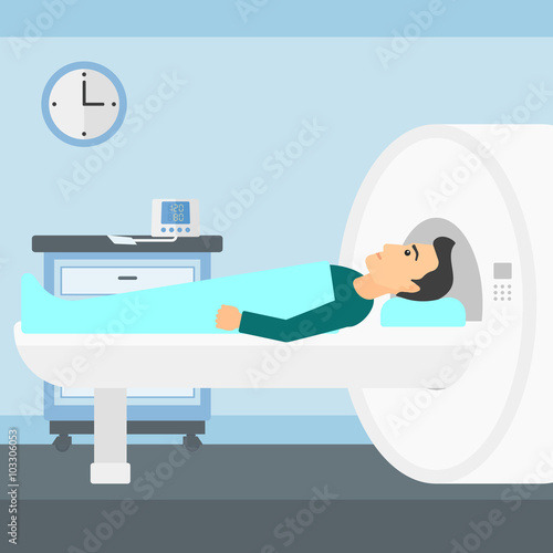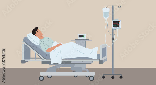 Измученный, перегруженный работой врач или интерн, сидящий на стуле в больничной палате рядом с пациентом, лежащим на каталке, плоская векторная иллюстрация. Усталый сонный медицинский работник. Выгорание на работе, отчаяние.
