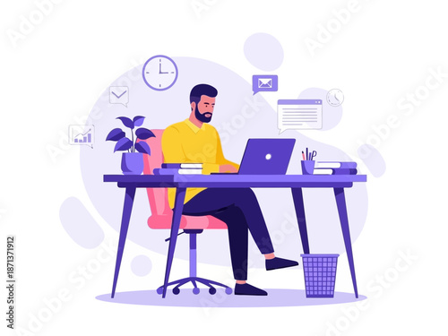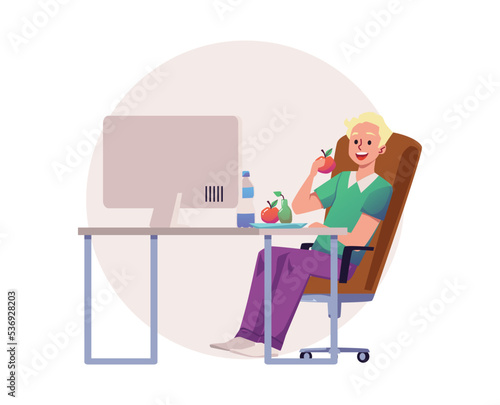 Молодой человек спит, сидя за столом в офисе, плоская векторная иллюстрация. Сонный сотрудник мультяшный персонаж, усталый офисный работник.