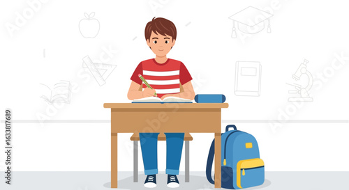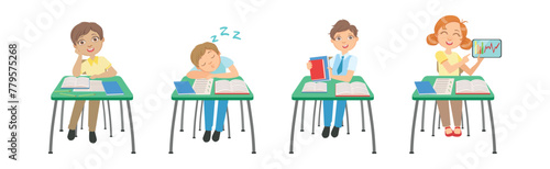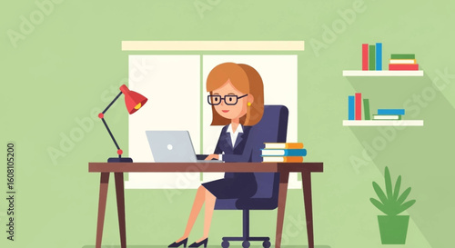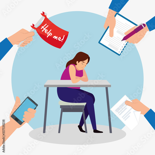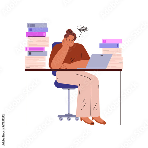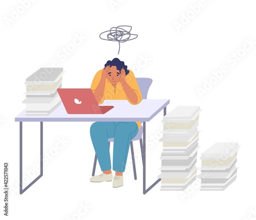 Усталая измученная женщина-сотрудник сидит за столом в офисе, держась за голову, плоская векторная иллюстрация. Синдром эмоционального выгорания, хроническая усталость, стресс, офисная депрессия, проблемы с психическим здоровьем, кризис на работе.