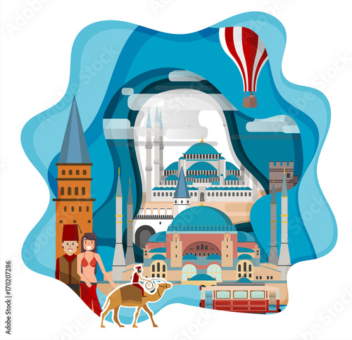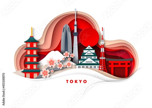 Город Токио, Япония, векторная иллюстрация в стиле бумажного искусства. Храмы, башни, знаменитые достопримечательности Японии и туристические аттракционы. Путешествия по всему миру.