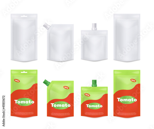Набор макетов упаковки томатного кетчупа, векторная иллюстрация, изолированная на белом фоне. Реалистичная заготовка и этикетка с томатным кетчупом - шаблоны пластиковых пакетов doypack.