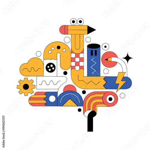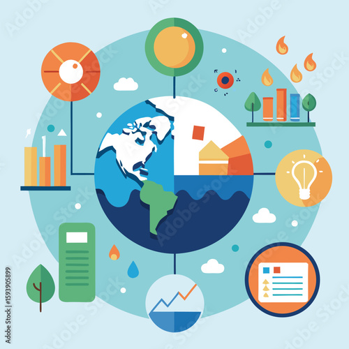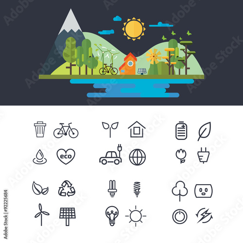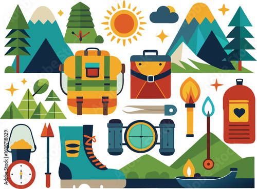 Рекламный плакат туристического агентства, баннер. Векторная плоская иллюстрация. Гора, воздушный змей, костер, палатка, рюкзак, долларовая монета, рука, держащая бутылку с угольной жидкостью для зажигалок. Концепция кемпинга, пешего туризма и треккинга.