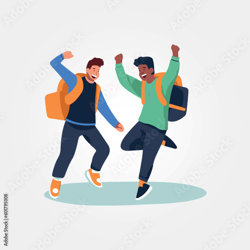 Туристические персонажи путешествия пешие прогулки, фотографирование, ходьба и бег с билетами, паспортом, багажом, векторная плоская изолированная иллюстрация. Путешествия, летние каникулы, приключения, пеший туризм, треккинговый туризм.