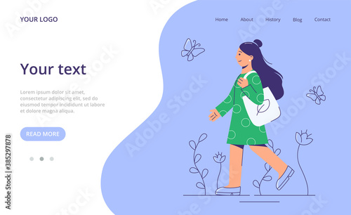 Туристы, гуляющие в горах. Концепция путешествий и приключений на открытом воздухе. Мужчина и женщина, скалолазание и треккинг. Векторный шаблон дизайна веб-сайта. Иллюстрация концепции сайта целевой страницы.