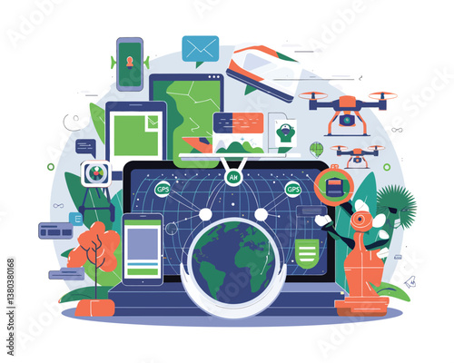 Грузовик доставки, огромный ноутбук с глобусом, булавки для определения местоположения, картонные коробки на экране и микросимволы, векторная иллюстрация дизайна в плоском стиле. Онлайн-система отслеживания доставки.