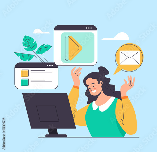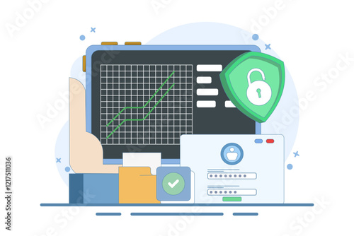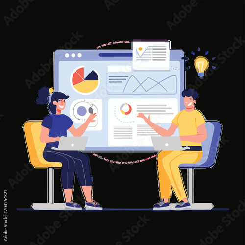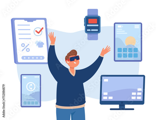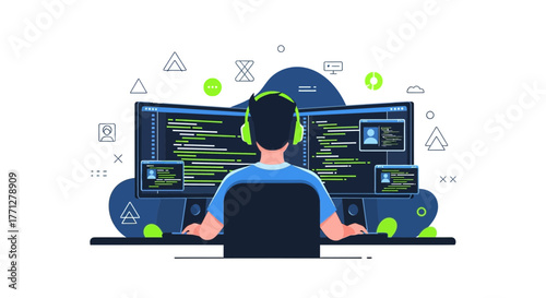 Успешный бизнесмен, трейдер смотрит на компьютерные мониторы, сидя за столом трейдера с поднятыми руками, плоская векторная иллюстрация. Фондовый рынок, инвестиции и трейдинг.