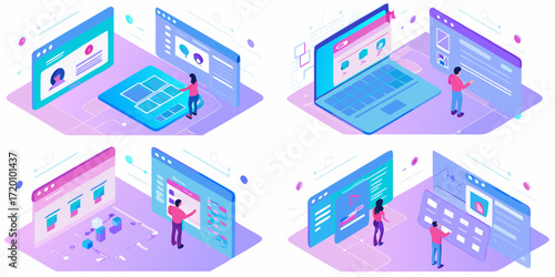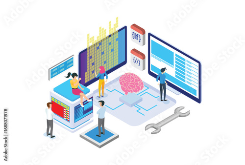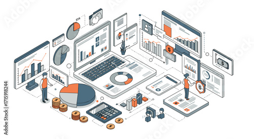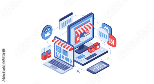 Векторная иллюстрация трейлера онлайн. Изометрический 3-d автомобиль-кемпер или дом на колесах для продажи или аренды на клавиатуре ноутбука. Интернет-магазины, элементы дизайна концепции электронной коммерции, выделенные на белом фоне.