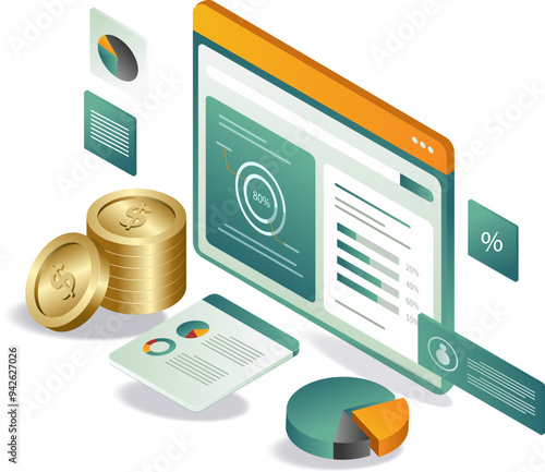 Страхование путешествий онлайн, векторная иллюстрация. Смартфон со страховым полисом, щитом, чемоданами, пассажирским лайнером, нажатием пальцем на кнопку покупки. Изометрическая композиция для плаката, баннера, страницы веб-сайта.