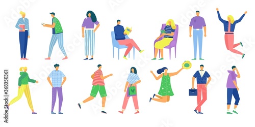 Набор значков для путешествующих людей, векторная иллюстрация дизайна в плоском стиле, изолированная на белом фоне. Туристы гуляют с дорожной сумкой, рюкзаком, фотографируются на камеру, мобильный телефон, прыгают, веселятся и т.д.