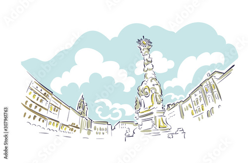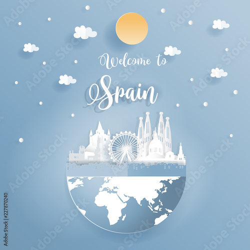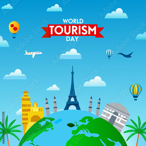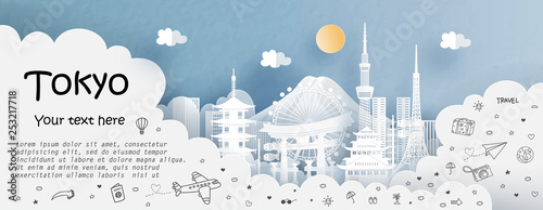 Шаблон туристического плаката, векторная иллюстрация в стиле бумажного искусства. Воздушные шары, летящие над силуэтами всемирно известных достопримечательностей, копируют пространство. Многослойная дорожная композиция из вырезанной бумаги для веб-баннера, страницы.