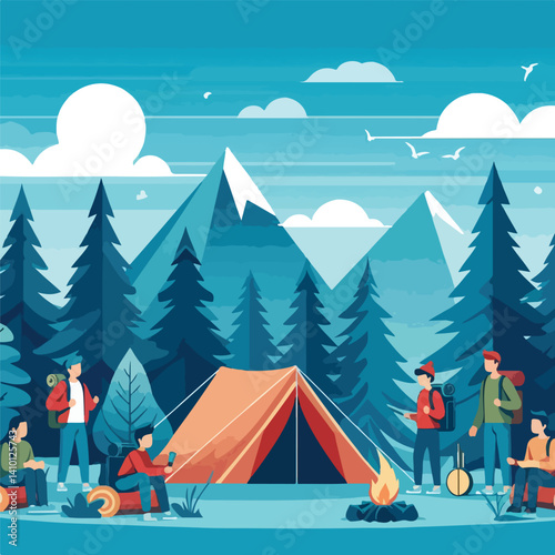 Проездные билеты в коробке, украшенная шарами рождественская елка, зимний ночной лесной пейзаж, векторная иллюстрация в стиле бумажного искусства. Рождественский тур, зимние каникулы.