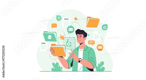 Мужчина-путешественник держит смартфон с паспортом вакцины против коронавируса на экране, плоская векторная иллюстрация. Сертификат иммунитета с qr-кодом, отметка о вакцинации. Путешествуйте после вакцинации. Новая норма.
