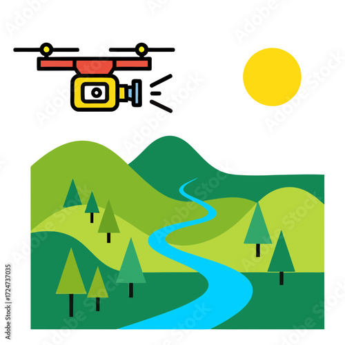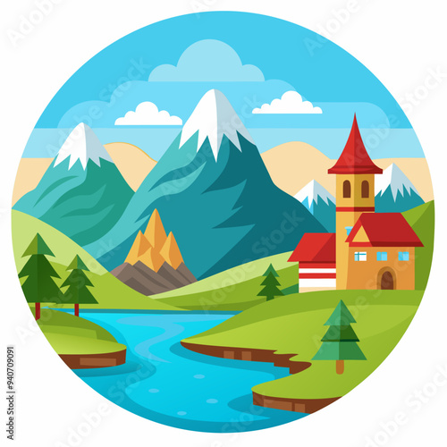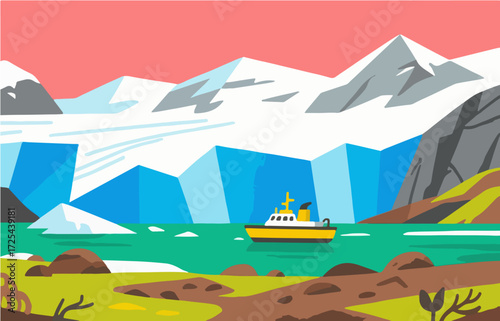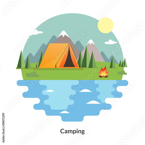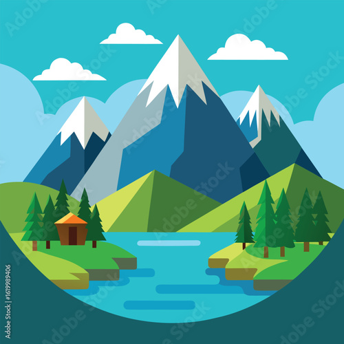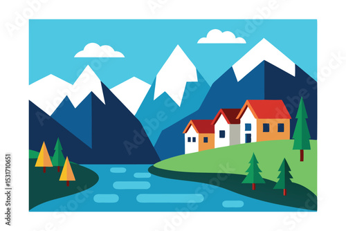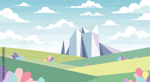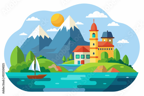 Путешествующий туристический фургон едет по дороге рядом с горами и пляжем, векторная иллюстрация в стиле бумажного искусства. Прекрасное морское побережье и горный пейзаж. Пейзаж с зелеными холмами. Туризм, дорожное путешествие.