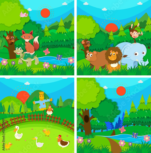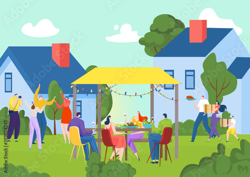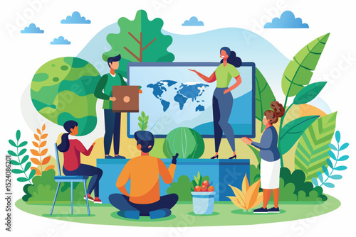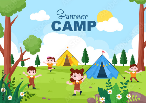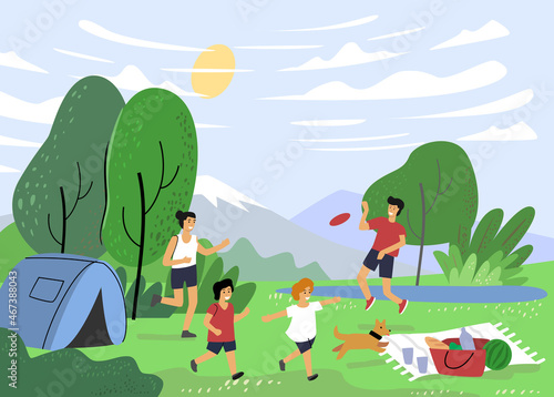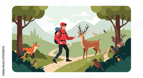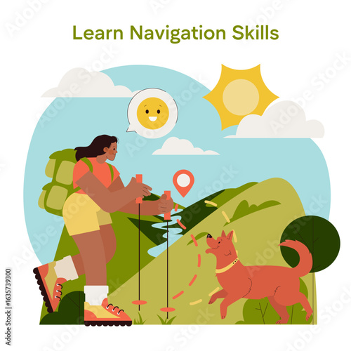 Плакат "Поездка в горы", шаблон баннера. Счастливая женщина, сидящая у костра в лесу, плоская векторная иллюстрация. Летние каникулы, походы, кемпинг. Исследуйте природу, горы, леса.