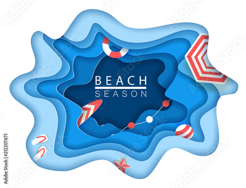Тропический пляж в стиле бумажного искусства. Векторная иллюстрация вырезки из бумаги с видом сверху. Шаблон концептуального плаката для летних каникул. Ремесло оригами