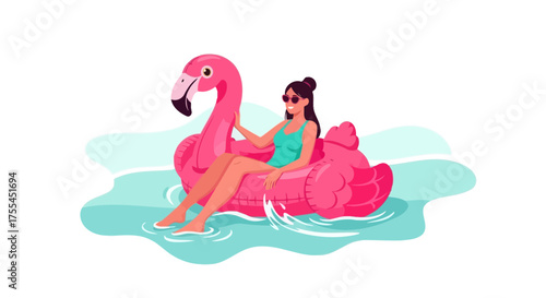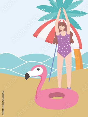 Дизайн посадочной страницы тропического пляжа, набор шаблонов баннеров веб-сайта, плоская векторная иллюстрация. Счастливые женщины загорают на надувном фламинго, пьют коктейль, занимаются серфингом. Пляжные водные развлечения, отдых