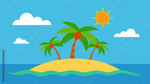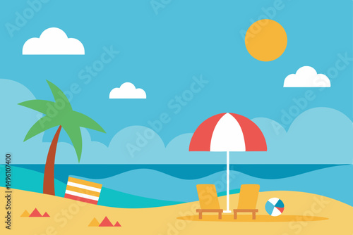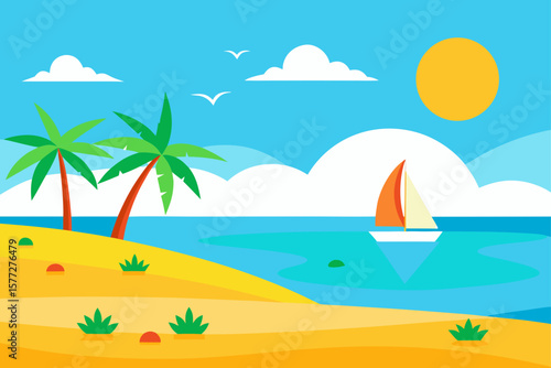 Красивый морской пейзаж с тропическим пляжем, маяком, векторная иллюстрация в стиле бумажного искусства. Летний пляжный отдых, туризм, путешествия.